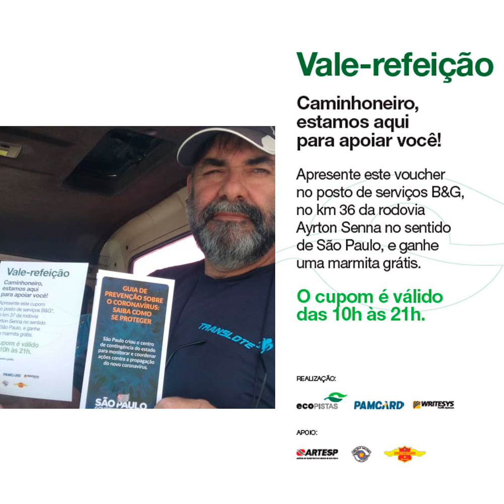 Desde o dia 28 de março, a Ecopistas tem colocado em prática uma iniciativa que contou com apoio de várias empresas do setor, inclusive do Pamcard, para auxiliar os caminhoneiros nas estradas durante o período de quarentena para a prevenção de combate ao coronavírus.